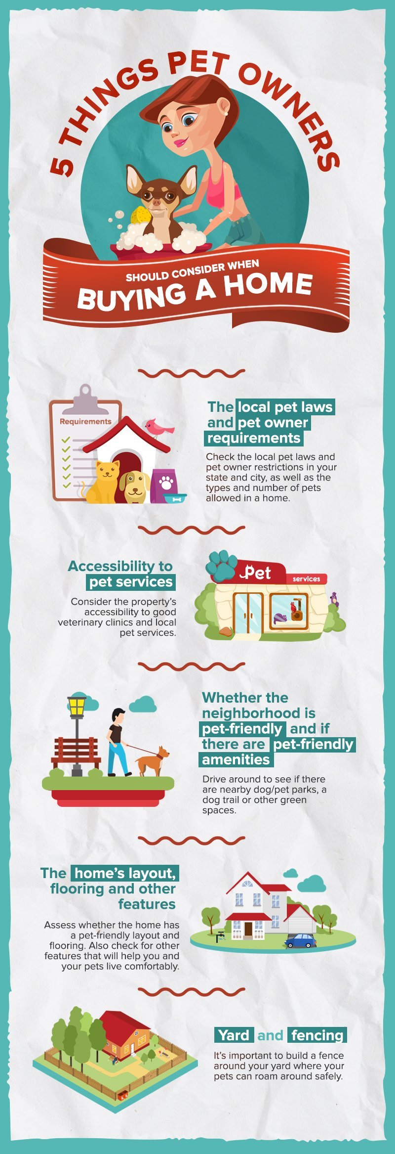 Like parents who will greatly consider a good school district when choosing a neighborhood, home buyers with pets should also consider the property's accessibility to good veterinary clinics and local pet services so that they can easily tend to their pets’ health and needs.