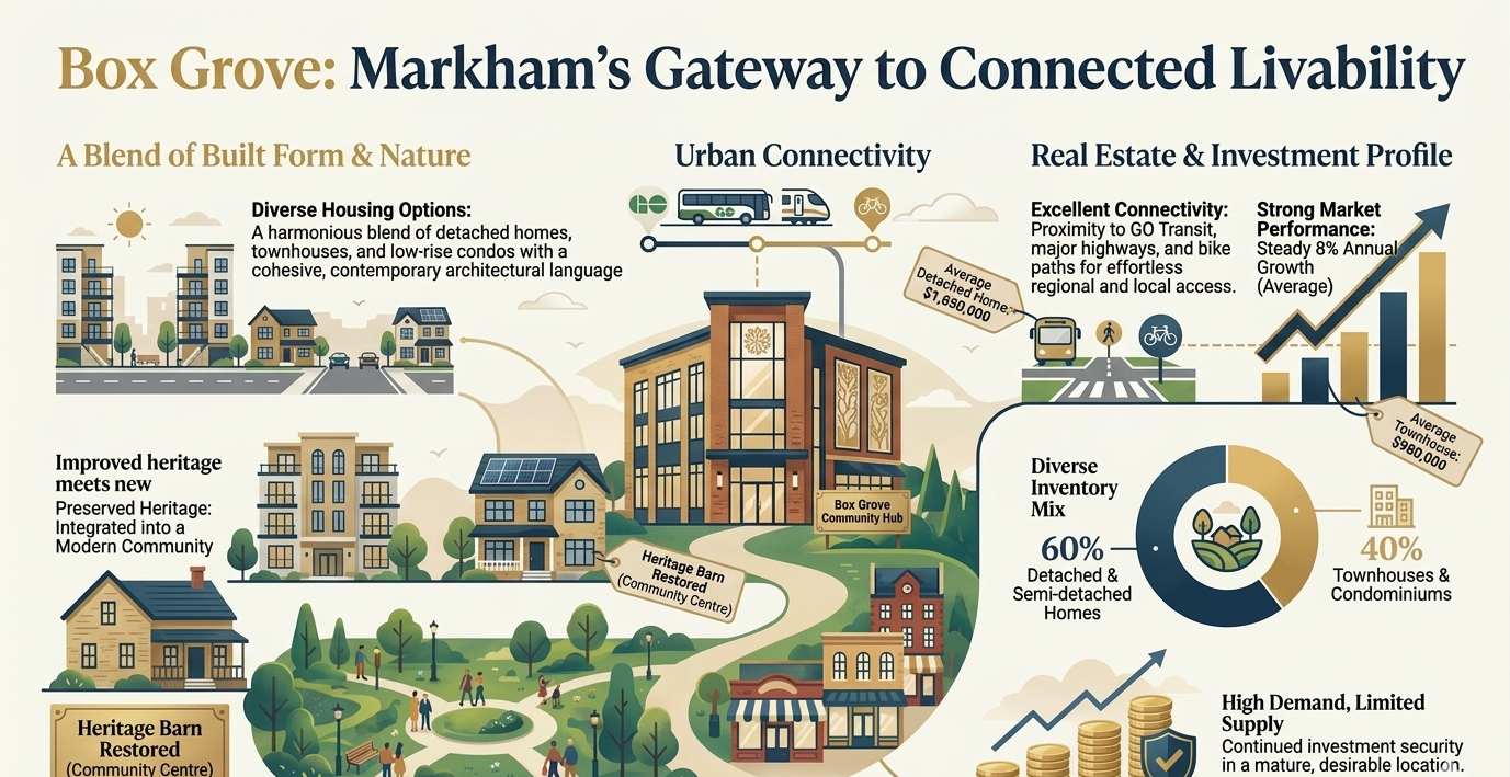 Box Grove is positioned as an accessible luxury neighbourhood within the Markham housing market, offering strong value compared to more premium communities like Angus Glen.
