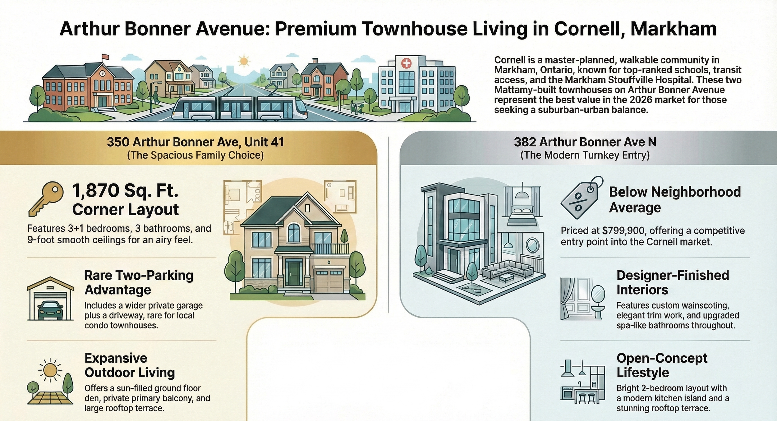 Arthur Bonner Avenue sits in the heart of Cornell, one of the most thoughtfully planned neighbourhoods in Markham, Ontario. Known for its pedestrian friendly streets, modern townhome developments, and proximity to essential amenities, this area has become a highly desirable destination for buyers searching for condo townhouses in Markham. The neighbourhood reflects a modern urban planning philosophy that emphasizes walkability, green space, and community connectivity.
