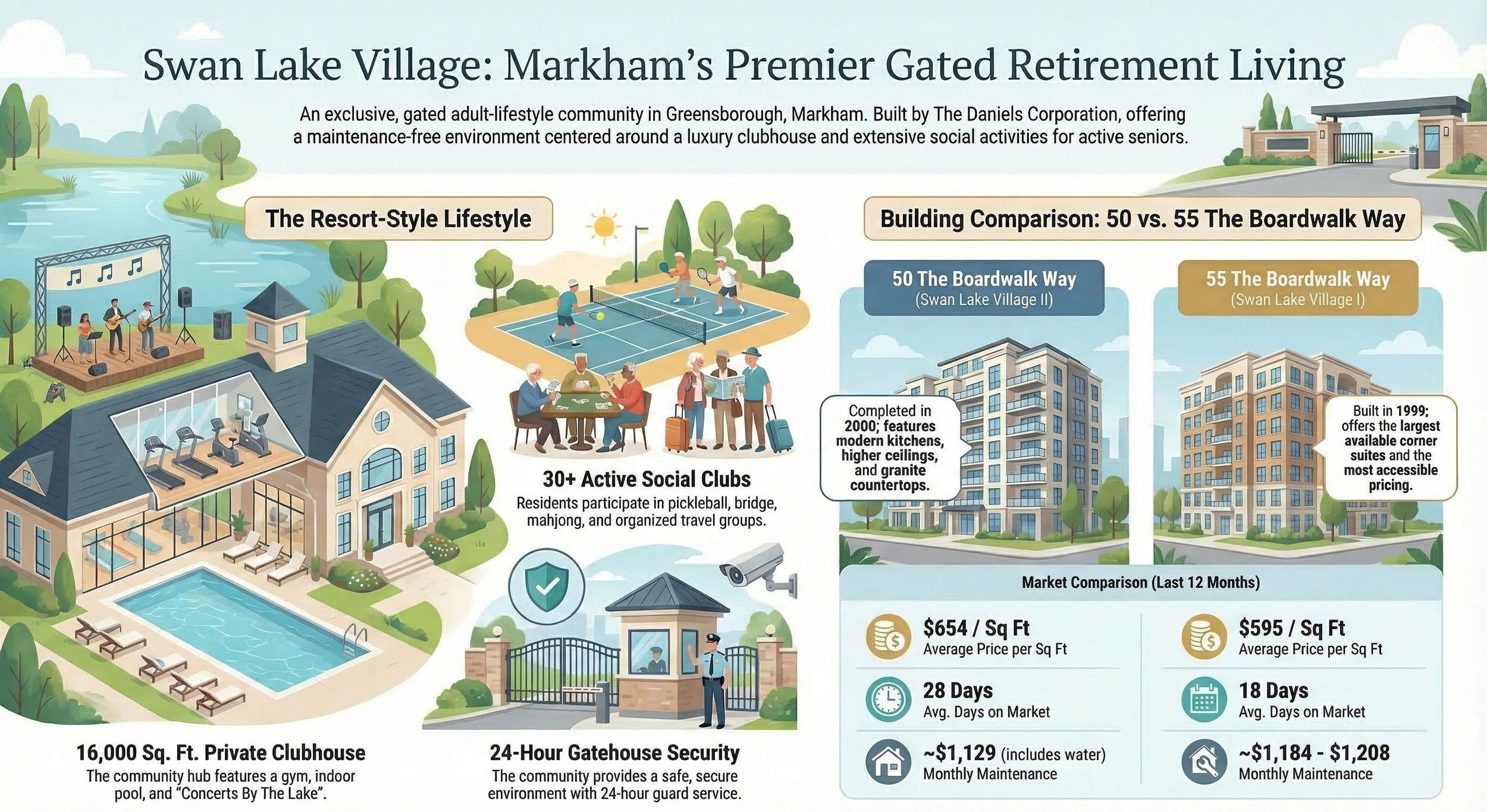 Swan Lake Village is a master planned adult lifestyle community developed by The Daniels Corporation, specifically designed for residents aged 55 and over. Unlike traditional condo developments in areas like Unionville, Cornell, or Wismer, Swan Lake Village emphasizes community living, wellness, and social engagement.